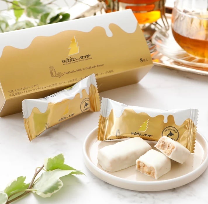 北海道バター使用の味わい深いサクほろ食感のバタービスケットとクリーミーなカシューナッツを北海道ミルクを使用したホワイトチョコレートでコーティング。